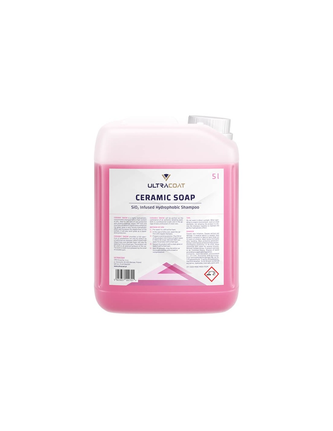 Ultracoat Ceramic Soap to zaawansowany szampon samochodowy o wysokiej zawartości SiO₂, przeznaczony do pielęgnacji pojazdów zabezpieczonych powłokami ceramicznymi, woskami, foliami PPF oraz winylowymi. Dzięki swojej skoncentrowanej formule produkt nie tylko skutecznie usuwa zanieczyszczenia, ale również intensyfikuje połysk, zwiększa śliskość powierzchni i zapewnia silny efekt hydrofobowy. Może być stosowany zarówno jako tradycyjny szampon, jak i aplikowany za pomocą pianownicy. Charakteryzuje się przyjemnym zapachem gumy balonowej.