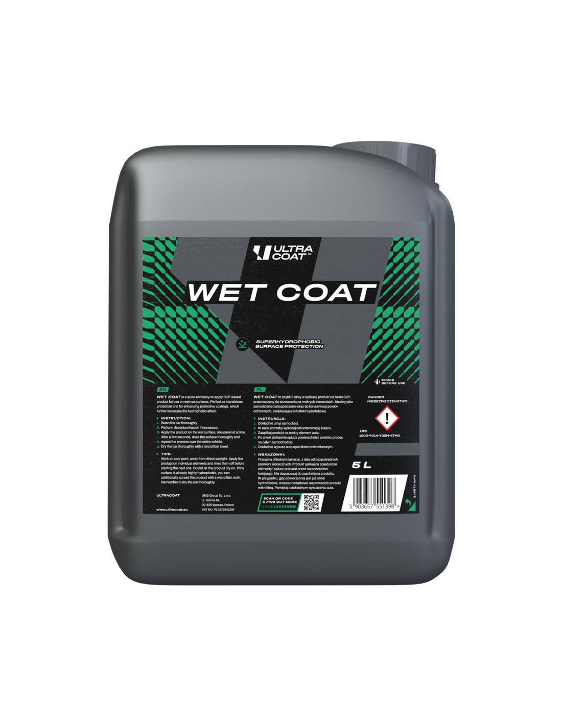 Wet Coat to szybkie w użyciu zabezpieczenie na bazie SiO2, aplikowane na mokre elementy auta. Nadaje lakierowi połysk i śliskość, wzmacniając przy tym efekt hydrofobowy. Może być stosowany samodzielnie lub jako odświeżenie powłok i wosków, ułatwiając mycie oraz osuszanie pojazdu. Pojemność: 5 L