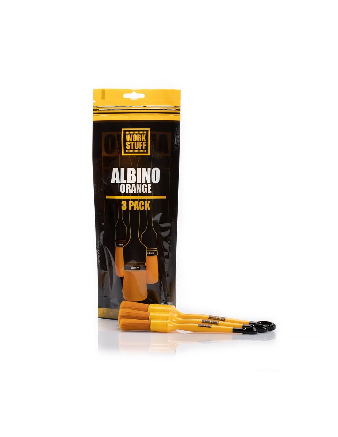 Work Stuff Detailing Brush Albino Orange 3 Pack to zestaw trzech wysokiej jakości pędzelków detailingowych o miękkim, syntetycznym włosiu, przeznaczonych do precyzyjnego czyszczenia wnętrza samochodu.