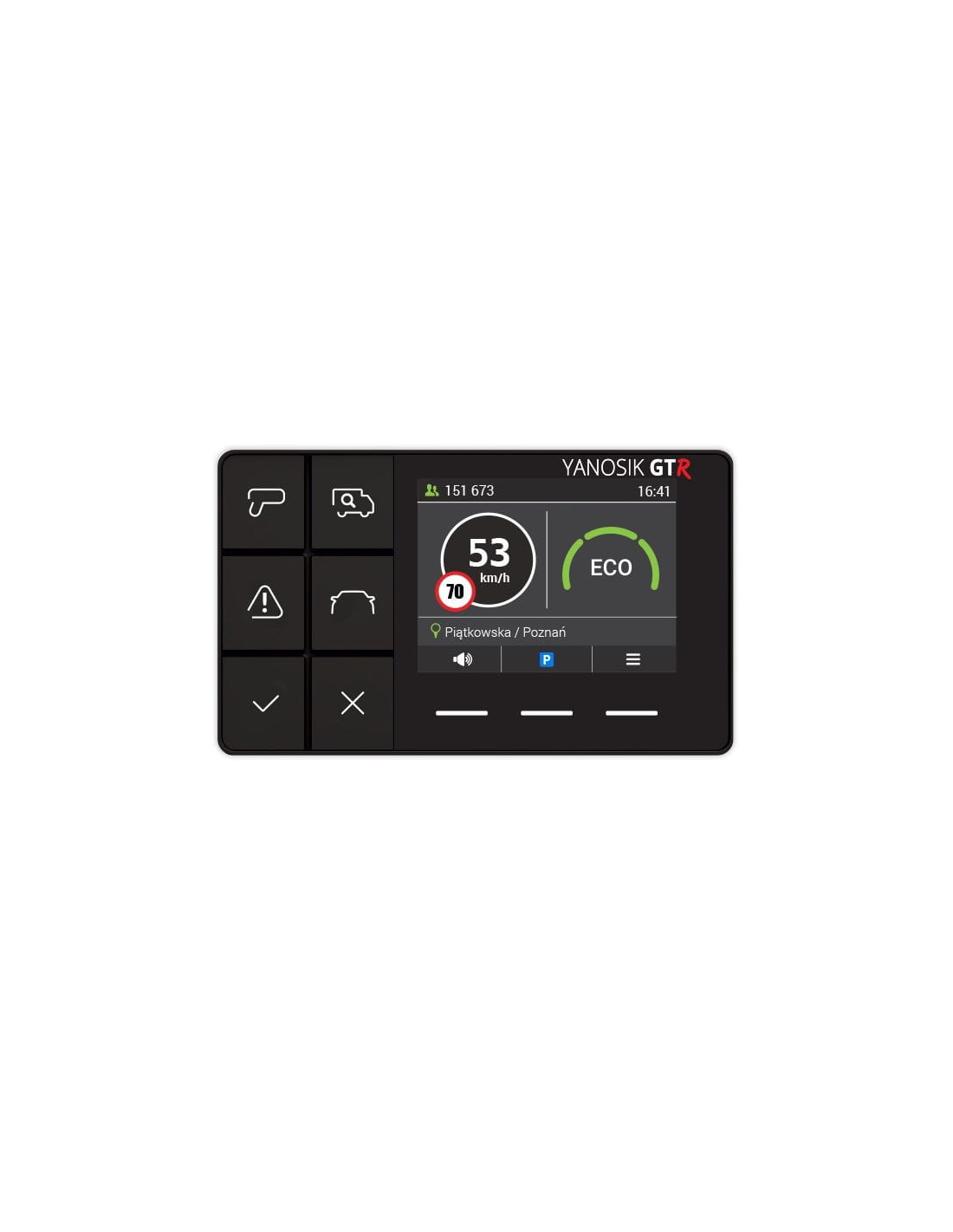 Yanosik GTR to następca modelu Yanosik GT – komunikatora drogowego, pozwalającego na otrzymywanie oraz wysyłanie informacji o rozmaitych zdarzeniach drogowych, takich jak nieoznakowane patrole policji, fotoradary czy też wypadki drogowe. W najnowszej wersji dodano takie udogodnienia, jak m.in.: informacje o ograniczeniach prędkości, wskaźnik stylu jazdy (ecodriving), asystent parkingowy (informacja o wjeździe do strefy płatnego parkowania wraz z cennikiem możliwość opłacenia parkingu w ponad 50 miastach na terenie Polski), podsumowanie trasy (ilość przejechanych km, czas, średnia prędkość a także ilości zdarzeń z Yanosika), lokalizator informujący o bieżącym położeniu użytkownika (miasto i ulica lub nr drogi). AKTUALNOŚCI Z DROGI Yanosik to społeczność ponad 1,5 mln kierowców miesięcznie. Nowe zgłoszenie pojawia się w systemie średnio co 3 sekundy. Z urządzeniem Yanosik GTR dostajesz informację o każdej nieoczekiwanej sytuacji w wyznaczonej przez Ciebie trasie: kontroli, pracach drogowych, wypadkach. Gdy zbliżysz się do kontroli prędkości za pomocą fotoradaru, system poinformuje Cię o obowiązującym na danym odcinku ograniczeniu. Po zakończonej jeździe otrzymasz jej podsumowanie – liczbę przejechanych kilometrów, czas, średnią prędkość czy liczbę wydarzeń zarejestrowanych w systemie Yanosik. DOPASOWANY DO TWOICH POTRZEB Urządzenie Yanosik GTR pasuje do każdego modelu samochodu. Jest lekkie, poręczne i proste w użytkowaniu. Nie wymaga montażu, a zasilane jest za pomocą złącza USB lub gniazda zapalniczki. Interfejs został przygotowany z myślą o najbardziej wymagających kierowcach. Komunikaty są proste i czytelne, zaś fizyczne przyciski pozwalają na bezpieczne i szybkie zgłaszanie zdarzeń na drodze. EKOJAZDA Specjalny wskaźnik, wyświetlany na ekranie urządzenia, pomoże Ci w optymalizacji Twojego stylu jazdy. Dzięki specjalnie zaprogramowanego algorytmowi dowiesz się, jak oszczędzić na paliwie (możesz go spalać nawet do 20% mniej) oraz na potencjalnych naprawach Twojego pojazdu. Dzięki temu zadbasz zarówno o swój portfel, jak i o otaczające Cię środowisko, emitując do atmosfery mniej spalin. TRYB MOTOCYKLISTY Jeśli jesteś fanem jednośladów, możesz skorzystać ze specjalnego interfejsu ułatwiającego korzystanie z urządzenia podczas jazdy motocyklem. Dzięki niemu możesz zabrać swojego Yanosika GTR na motocyklową przejażdżkę i cieszyć pełnią jego możliwości. Duże fizyczne klawisze pozwalają na łatwą obsługę urządzenia w rękawiczkach, a specjalny tryb interfejsu sprawi, że wszystkie komunikaty będą jasne i czytelne. PARKUJ NA LUZIE Jedną z najciekawszych nowych funkcji jest możliwość płacenia za parkowanie bezpośrednio z poziomu urządzenia – Yanosik Parking by SkyCash. Dzięki temu nie musisz już martwić się, jeśli w strefie płatnego parkowania zabraknie Ci drobnych. Możliwość opłacania postoju jest dostępna już w ponad 50 miastach całej Polski. Więcej szczegółów odnośnie usługi znajdziesz na stronie yanosik.pl/parking BAZA FOTORADARÓW Z TERENU CAŁEJ EUROPY Baza danych urządzeń Yanosik GTR została wzbogacona o lokalizacje fotoradarów rozmieszczonych w poszczególnych państwach Europy. Dzięki temu możemy wyjeżdżać za granicę bez obaw o potencjalne mandaty – komunikatory ostrzegą nas w momencie, gdy będziemy zbliżać się do miejsc pomiarów prędkości. POŁĄCZ URZĄDZENIE Z DARMOWĄ APLIKACJĄ Pobierz bezpłatną aplikację Y24 i zyskaj dodatkowe możliwości. W Y24 sprawdzisz lokalizację Twojego auta na mapie a także przejrzysz historię Twoich zgłoszeń i podziękowań. Z poziomu aplikacji z łatwością przedłużysz też abonament dla Twojego Yanosik GTR.